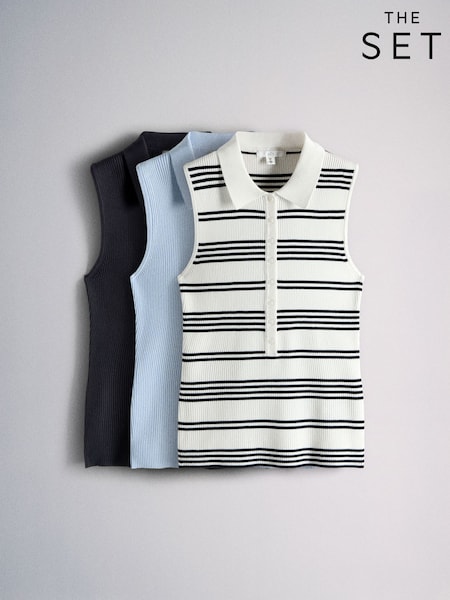 The Set 3 Pack Fine Knit Sleeveless Polo Shirt Navy/Blue/Cream Stripe