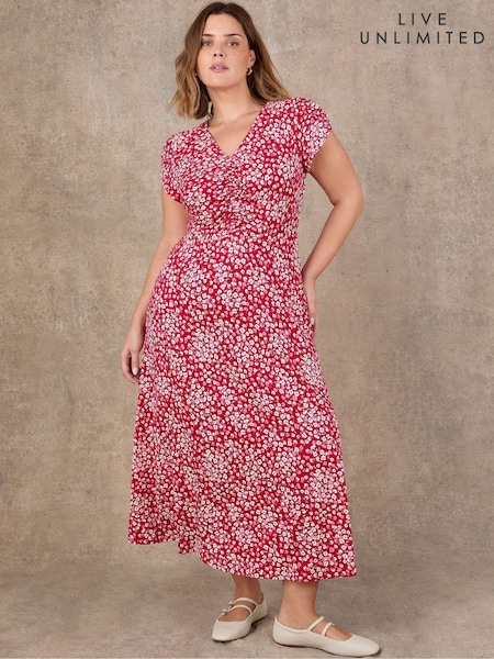 Live Unlimited Red Petite Ditsy Print Ruched Short Sleeve Dress