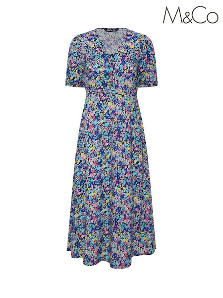 M&Co Blue Petite Ditsy Puff Sleeve Dress