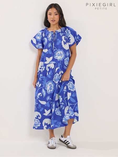 PixieGirl Petite Blue Seashells Puff Sleeve Midi Dress