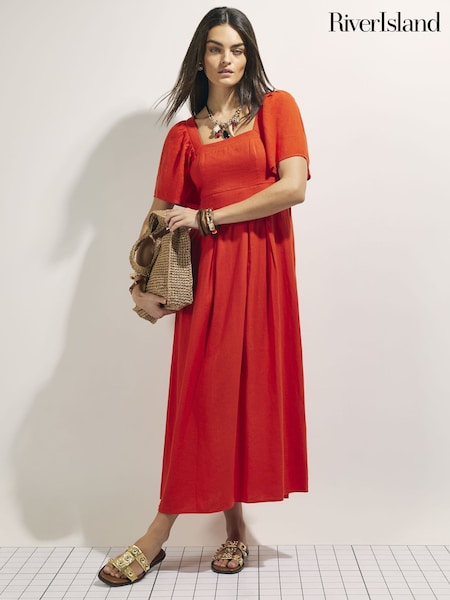 River Island Red Puff Sleeve Shirred Midi Dress