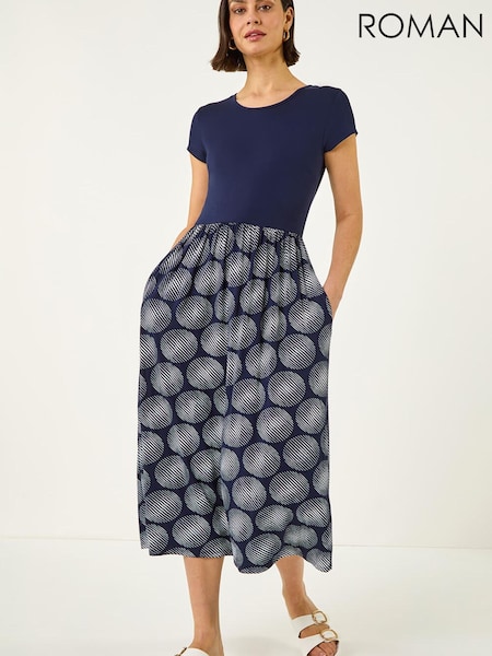 Roman Blue Contrast Geo Print Stretch Midi Dress