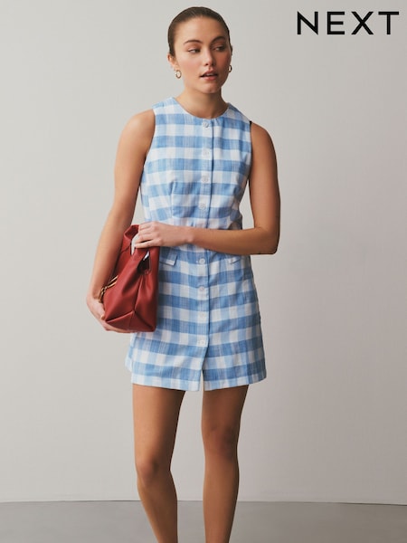 Chambray Blue Gingham Check Sleeveless Waistcoat Button Through Mini Dress