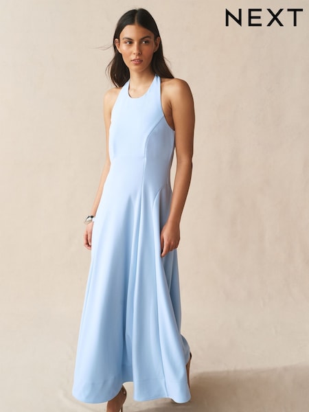 Sosandar Blue Halter Neck Pleated Skirt Dress
