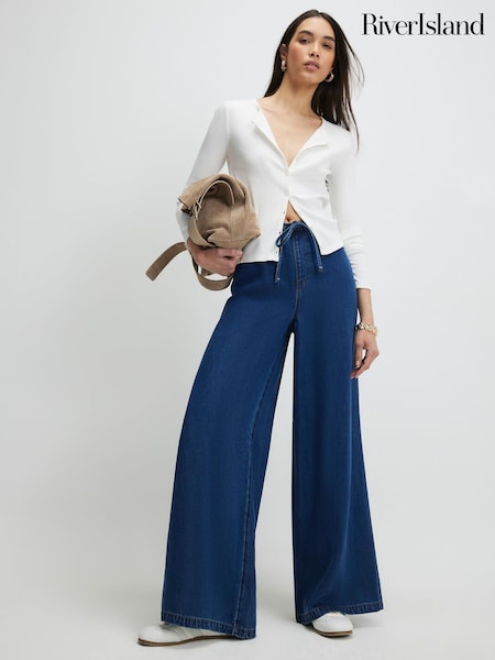 River Island Blue High Rise Pull On Wide Leg Jeans