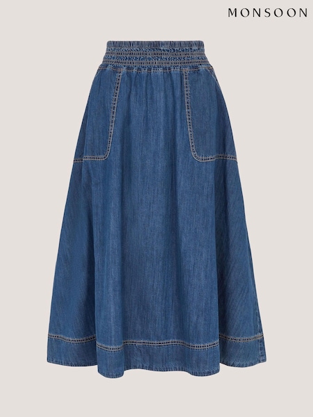 Monsoon Blue Sophie Shirred Denim Midi Skirt