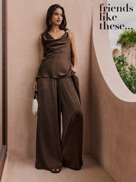 Friends Like These Chocolate Brown Elasticated Waist Satin Wide Leg Trousers