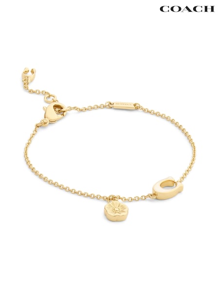 COACH Gold Tone Signature C Tea Rose Strand Bracelet