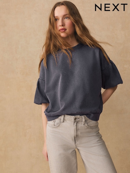 Washed Charcoal Grey Puff Sleeve Short Sleeve Sweat Top