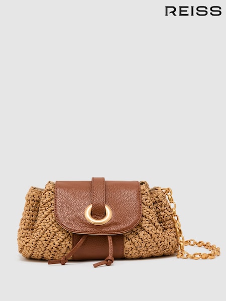 Reiss Natural Lori Raffia-Effect and Leather Shoulder Bag