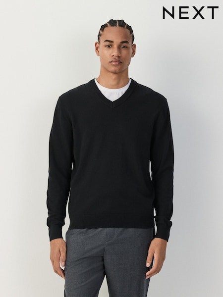Black V-Neck Regular Fit Cotton Rich Jumper