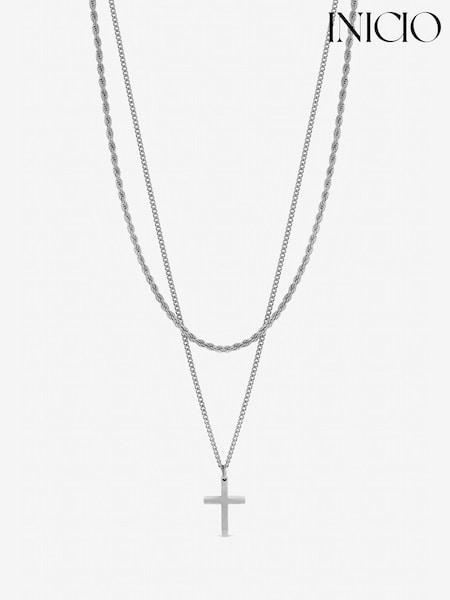 Inicio Silver Steel Waterproof Double Row Cross Necklace Gift Pouch