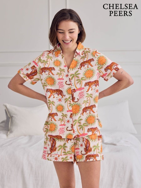 Chelsea Peers Natural Cheesecloth Siesta Tiger Print Short Button Up Pyjamas Set