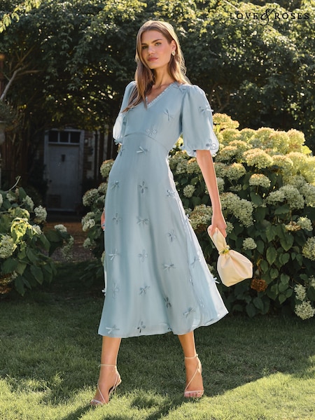 Love & Roses Puffermet V-hals Midikjole med Sløyfe