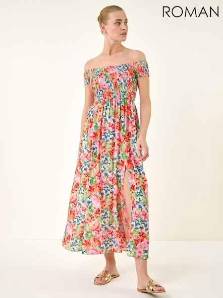 Roman Blomstrete Print Bardot rynket Midikjole