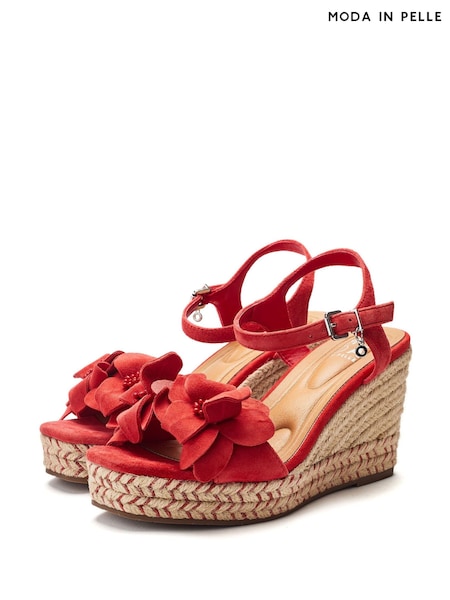Red Faux Suede - Love & Roses Blomsterkorsasje 2 Sommer Wedge-sko med mellomhøy hæl